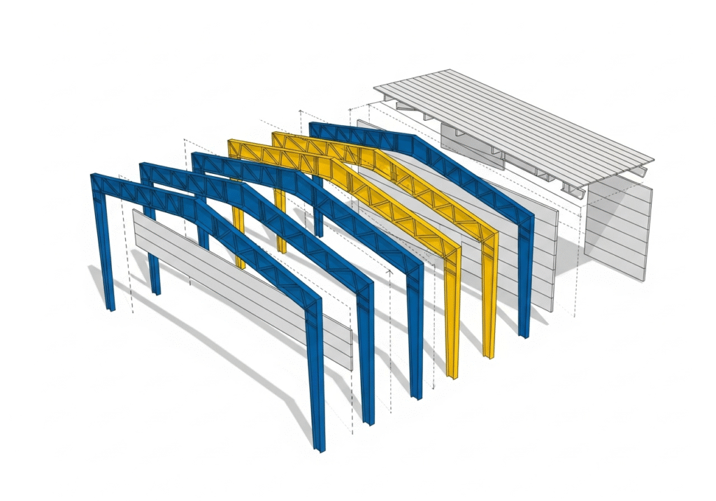 A PEB system has three main types of components. First are the primary frames. These are the main steel skeletons of the building, typically I-beams that form the columns and roof rafters. They bear the main load of the structure. Second are the secondary structural members. These include parts like purlins and girts, which are smaller steel components that span between the primary frames. They support the roof and wall sheeting and transfer loads to the main frame. Third is the roof and wall cladding. This is the outer skin of the building, usually made of metal sheets, which provides weather protection.